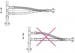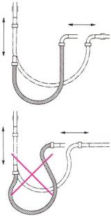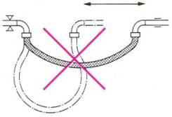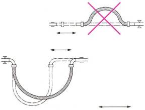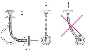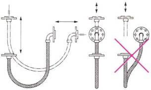 Пример 6. Для компенсации большого осевого удлинения на прямом участке трубопровода большой протяженности установите рукав с изгибом 1800. Не допускается осевое растяжение или сжатие рукава.