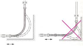 Металлорукав, установленный с изгибом 900, может компенсировать тепловое удлинение в одном или двух направлениях. Необходимо только выбрать соответствующий тип рукава и профессионально выполнить установку в соответствии с функциональными требованиями. Рекомендуется устанавливать рукав с изгибом 900 в направлении, которое естественным образом определяется трубопроводом (края или ряды труб).